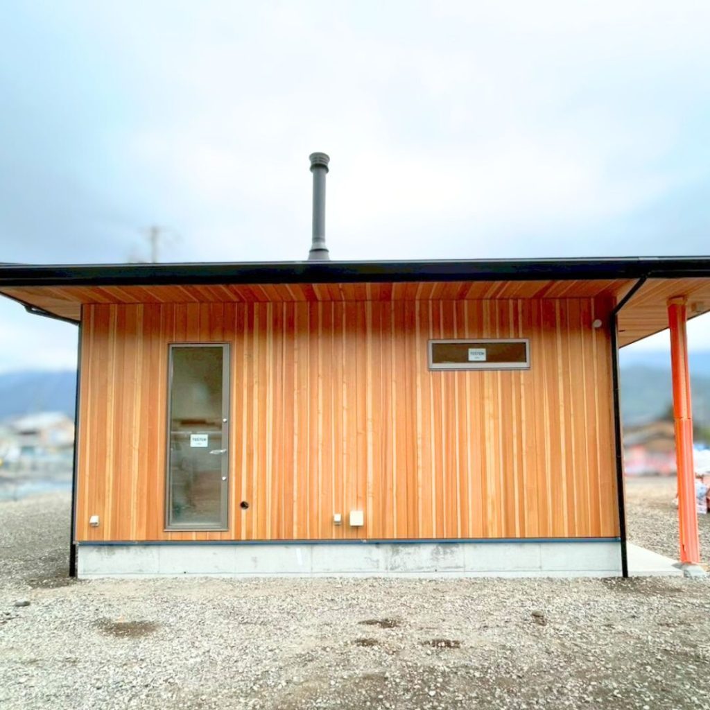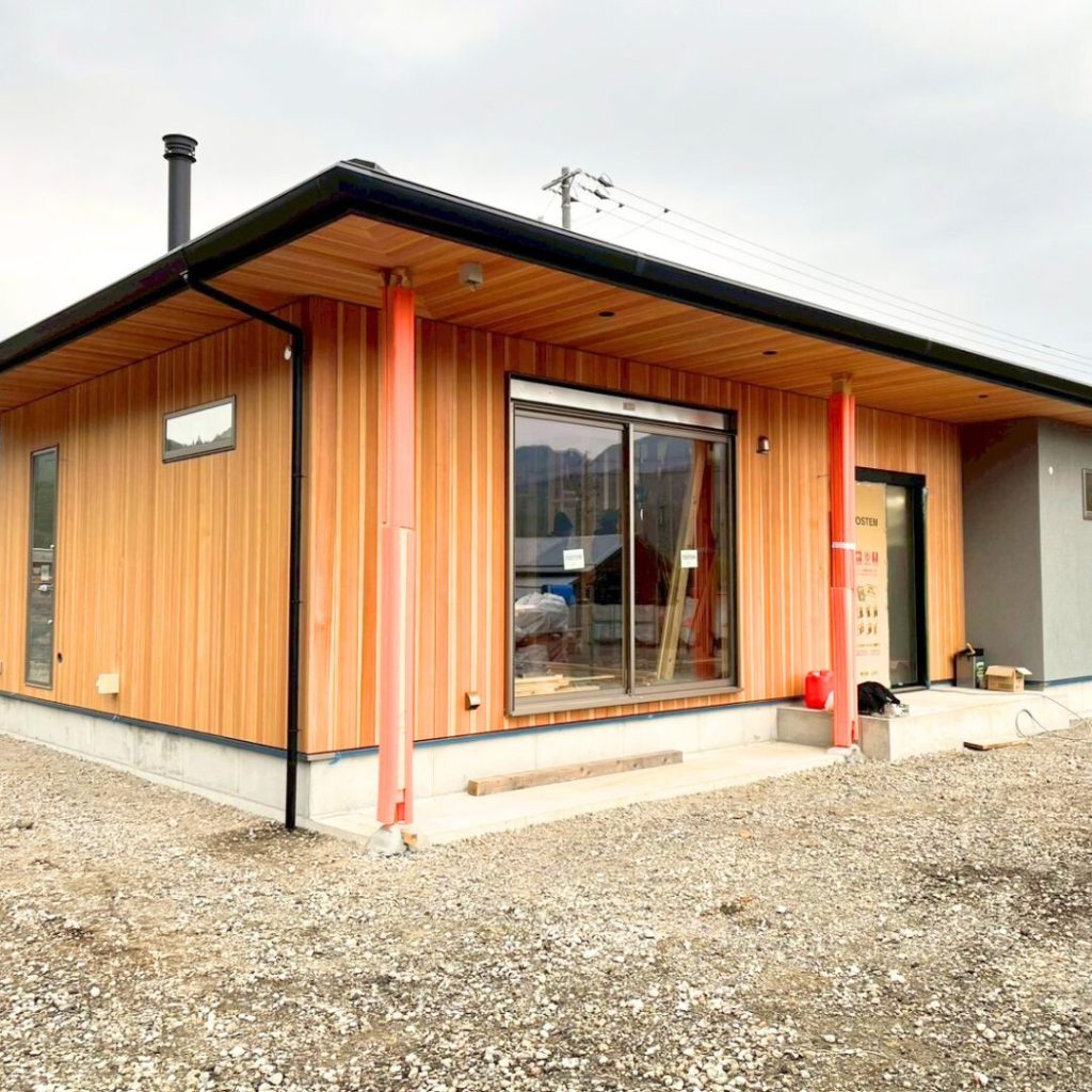 勝手口まわりの側面です。杉板の無垢材を貼っていて軒天と木目が揃っています。