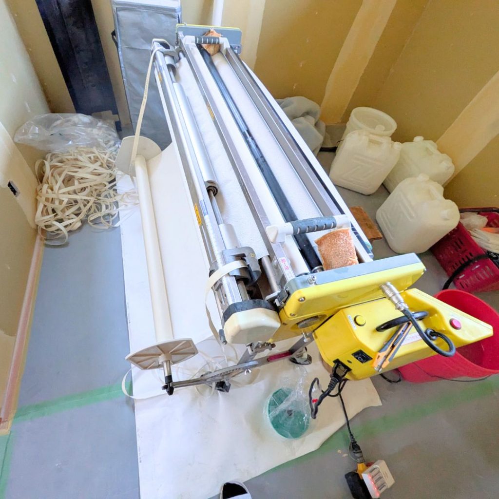 糊付け機を使用し、クロスに糊をつけていきます。(いちばん上の機械が糊付け機です。)